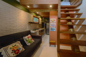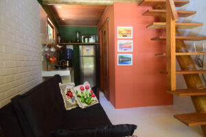 São 2 chalés aconchegantes, possuem na parte superior o quarto com cama queen, TV 32” polegadas, armário, toalhas, roupa de cama e rede na varanda de fundos e banheiro.